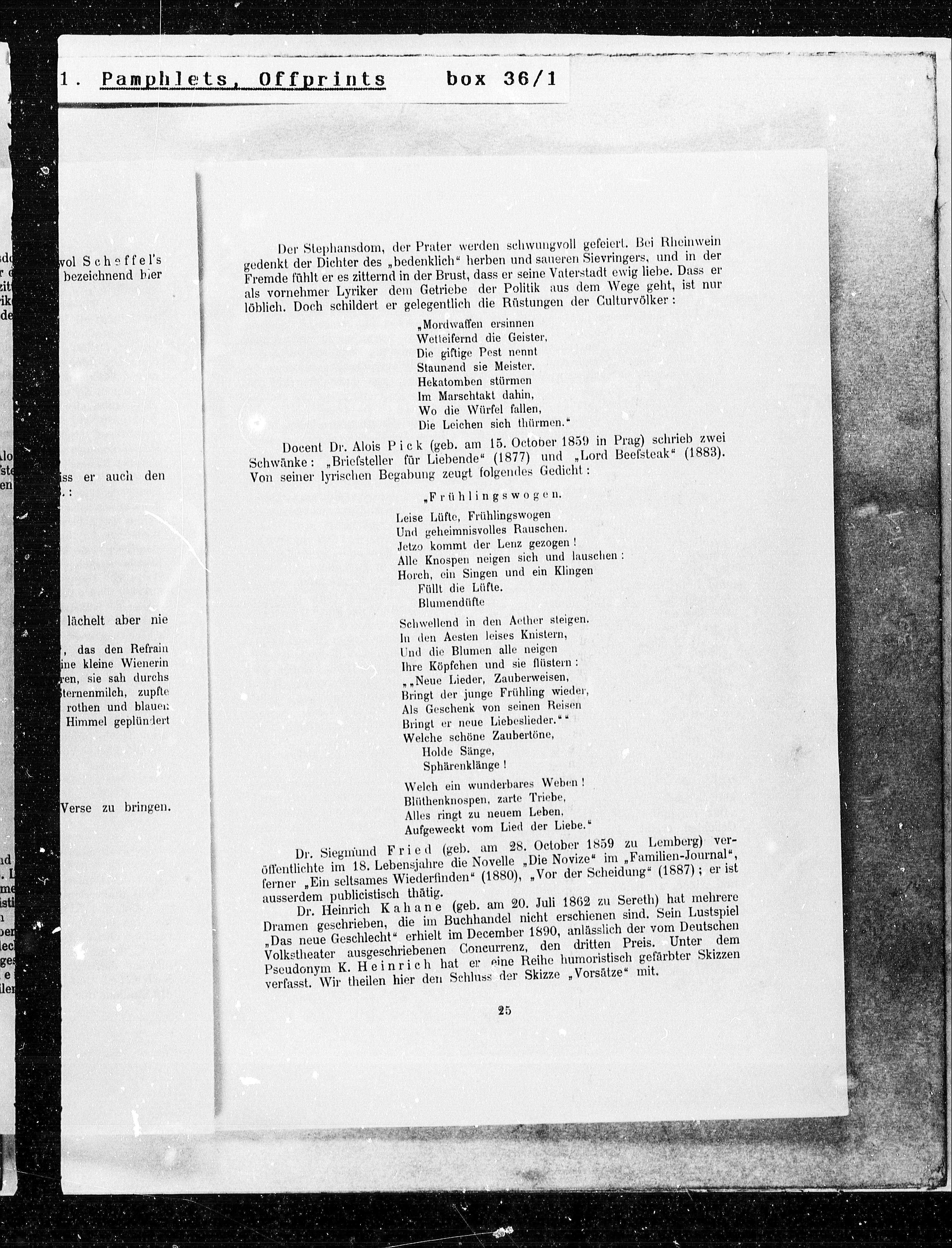 Docent Dr. Alois Pick (geb. am 15. October 1859 in Prag) schrieb zwei