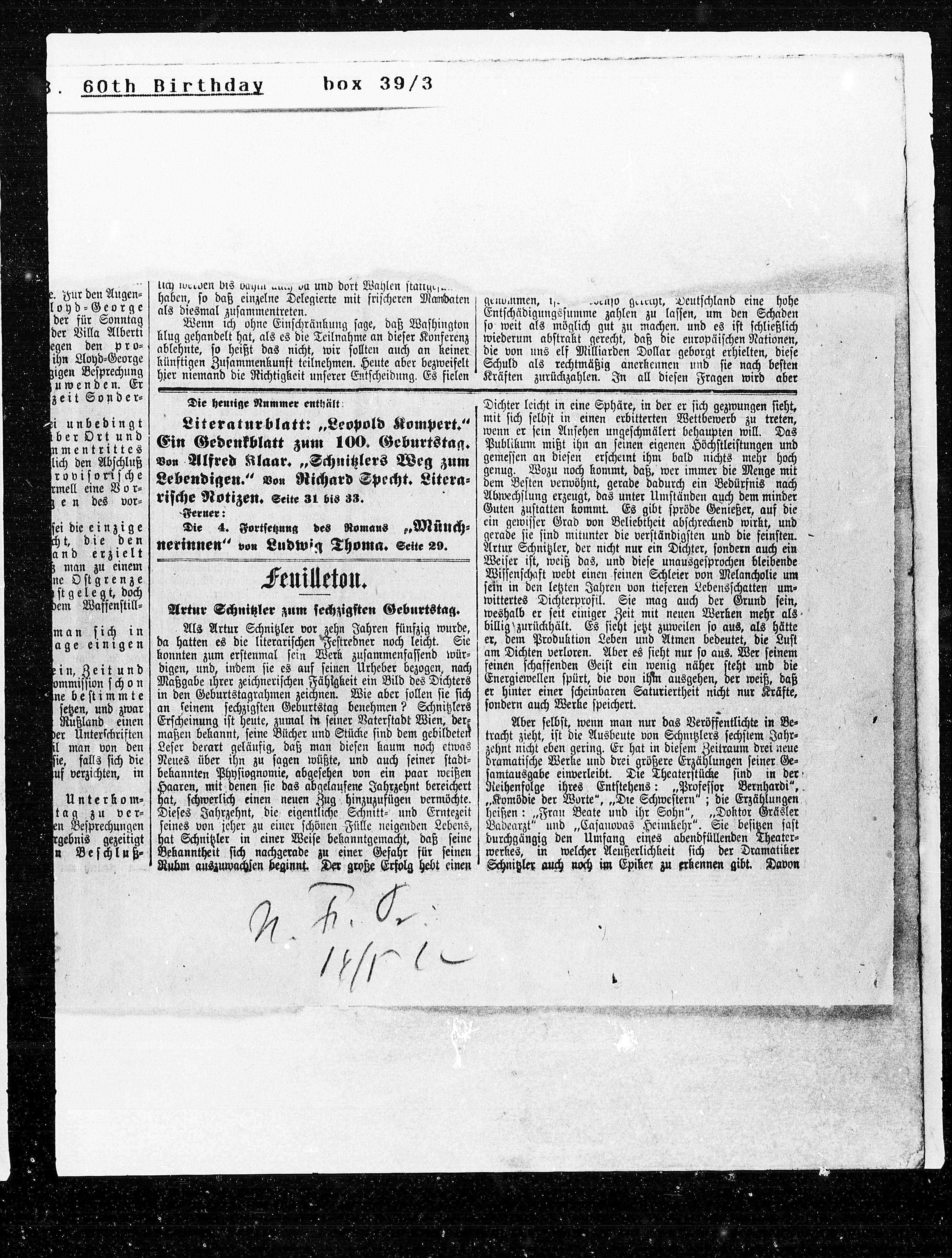 Artur Schnitzler zum sechzigsten Geburtstag.
