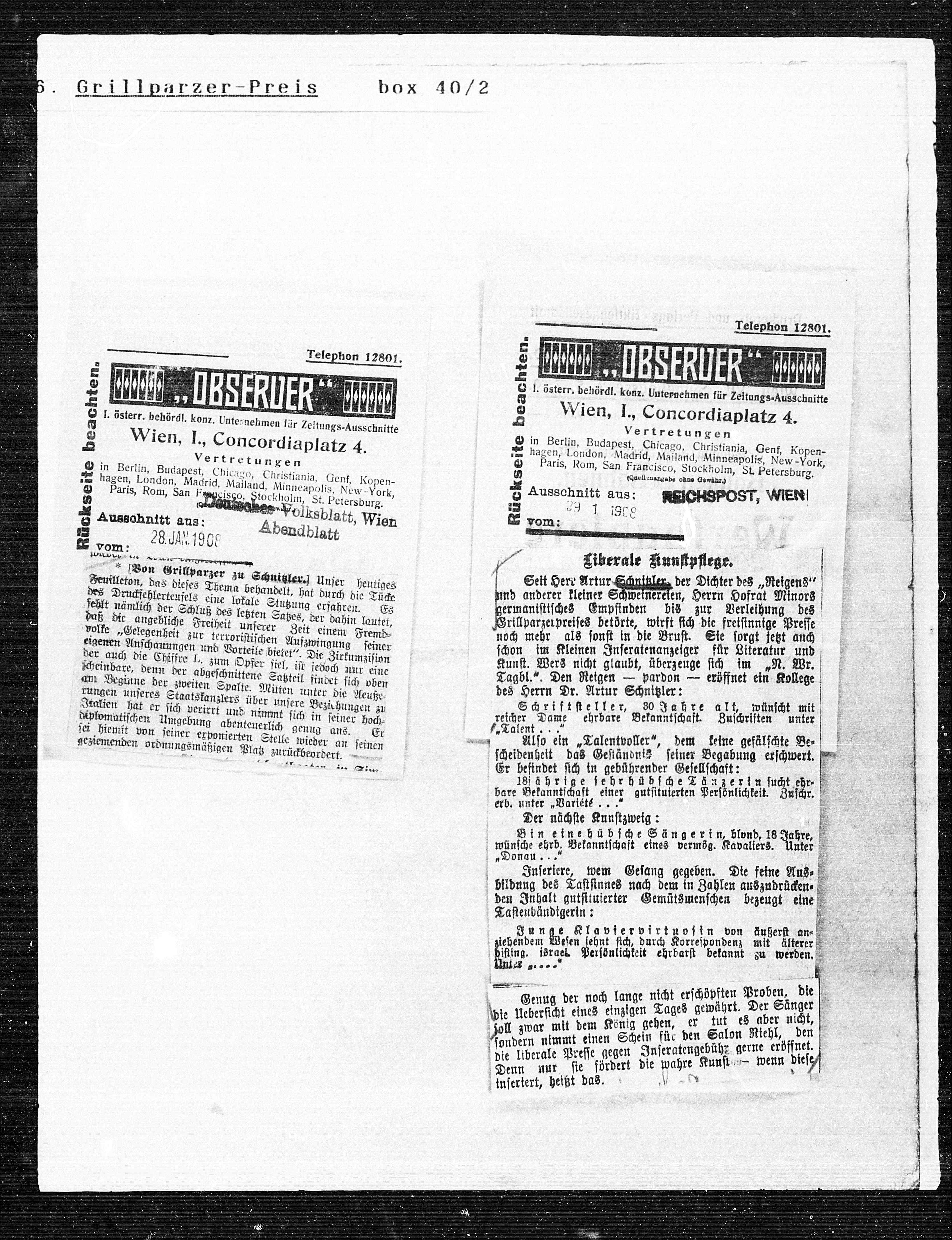 O l. österr. behördl. konz. Unternehmen für Zeitungs-Ausschnitte