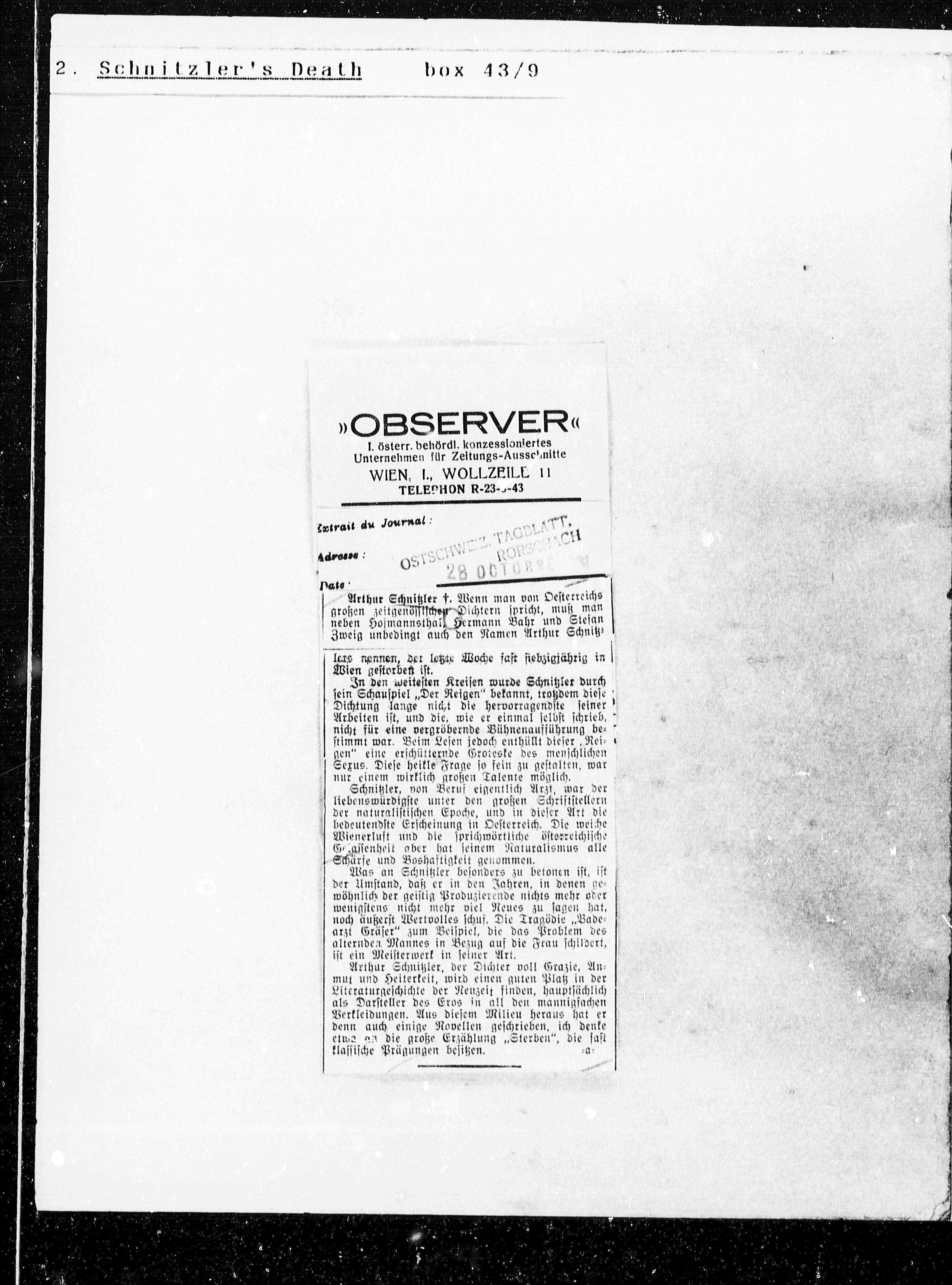 Arthur Schnitzler f. Wenn man von Oesterreichs Arthur Schnitzler f. Wenn man von Oesterreichs