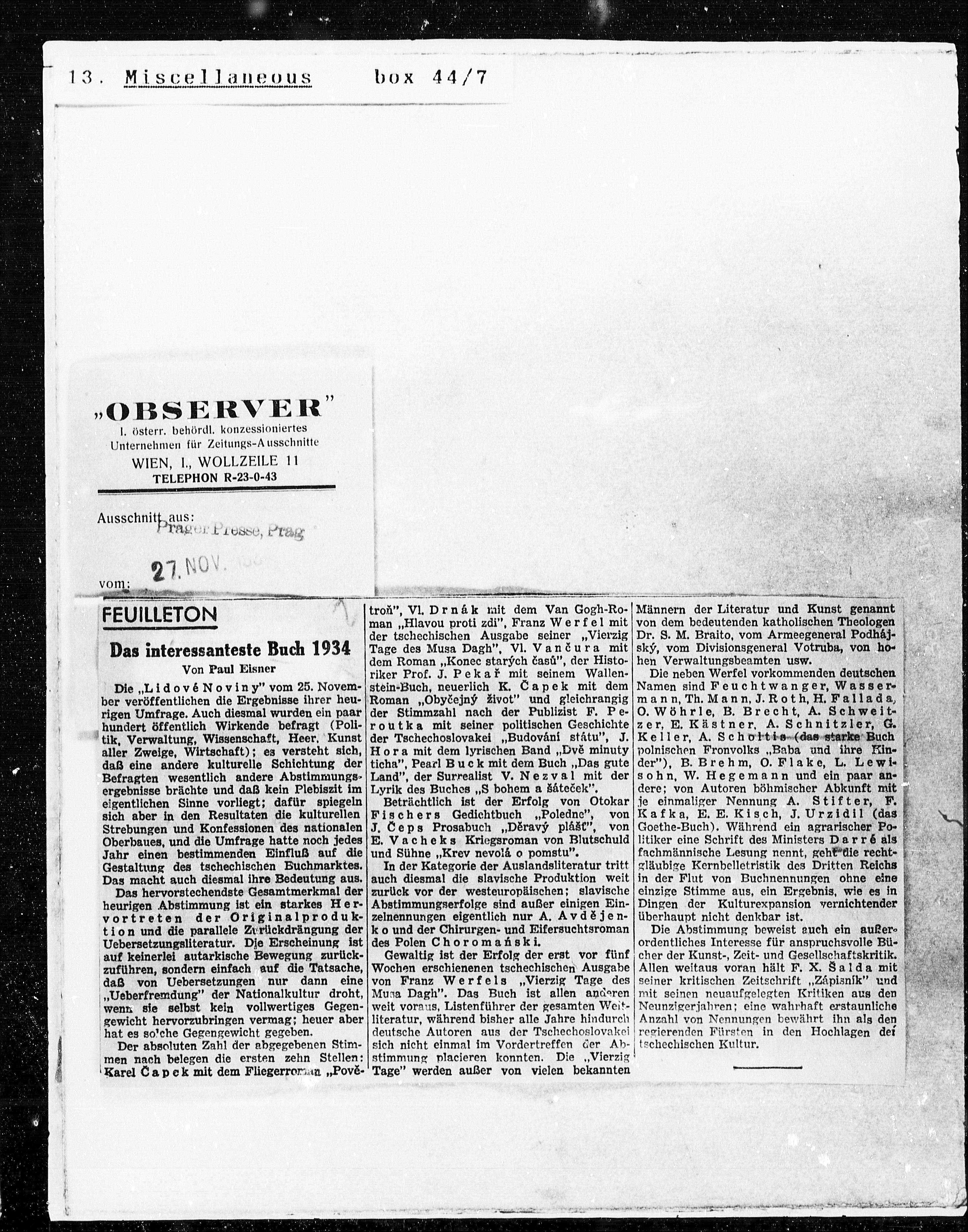 Die „Lidové Noviny“ vom 25. Novem- stein-Buch, neuerlich K. Capek mit dem Namen sind Feuchtwanger, Wasser¬